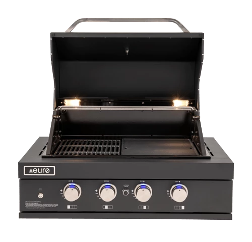 The 4 Burner Black Built-In BBQ will have you entertaining every night! With a modern black powder-coated finish, this stylish BBQ will look fantastic in any outdoor setting. It features quality 304-grade stainless steel tube burners, 430-grade stainless steel flame tamers, cast iron grill and griddle plate and is backed by a 3-year warranty. Other features include a warming rack, removable drip tray, push button battery ignition, and a BBQ cover is included.