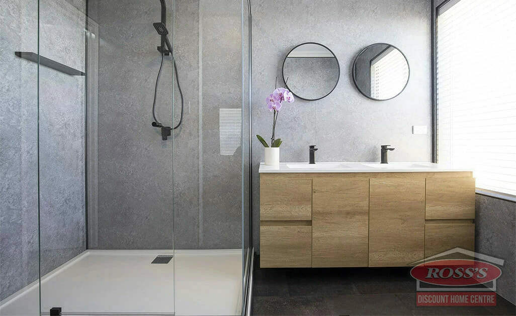 Introducing the contemporary and industrial Concrete Wall Panel from Ross’s Discount Home Centre – your ultimate solution to traditional tiling for shower walls. Whether embarking on a budget bathroom renovation or starting from scratch, these Bathroom Wall Panels in Perth are a superb choice. With its urban industrial aesthetic, this panel seamlessly integrates elements of industrial, mid-century modern, and farmhouse styles, offering a versatile addition to your bathroom renovation!