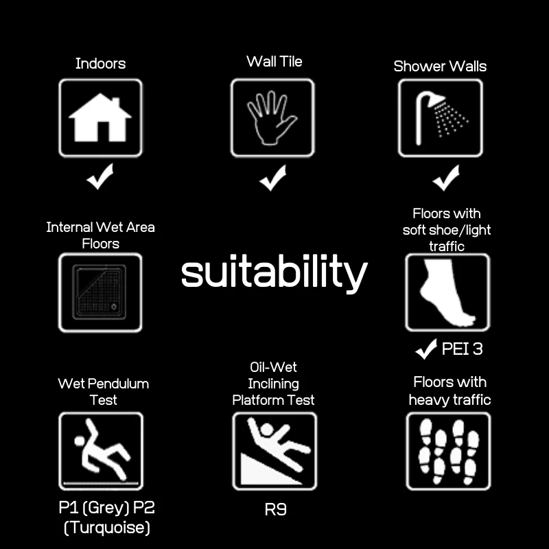 It is rated PEI3, P1 (grey parts of the tile), P2 (turquoise parts of the tile) and R9.