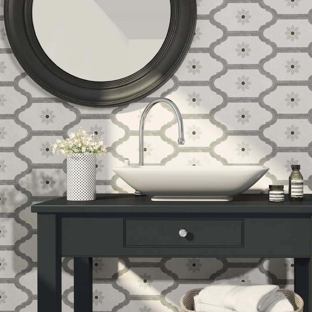 Daphne Grey is a porcelain feature wall tile with a rare provenzal-look. It features classic curves enclosing a floral focal point in shades of grey, offering an innovative take on a traditional Spanish tile design.