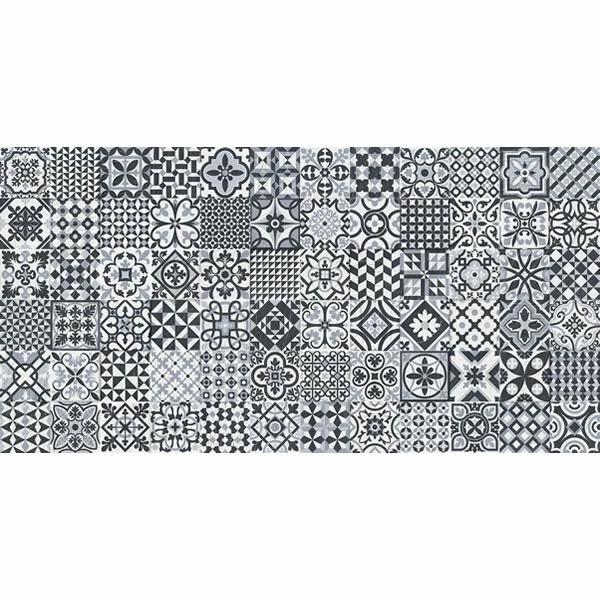 The Deco Heritage Mix Black tile is a large-sized feature tile which is the ideal choice for your bathroom. It comprises a mix of 72 different geometric patterns in varying shades of white black and grey and features a textured matte finish.
