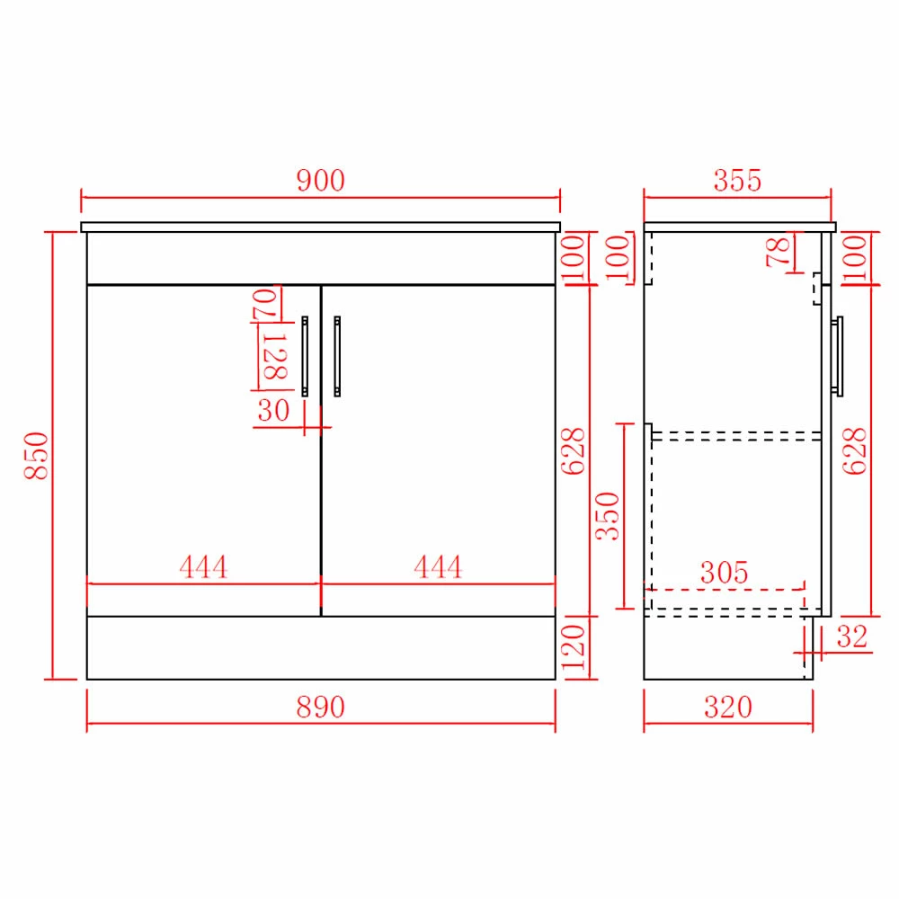 The Jessica PVC Vanity measures 900mm width x 350mm depth x 880mm in height.