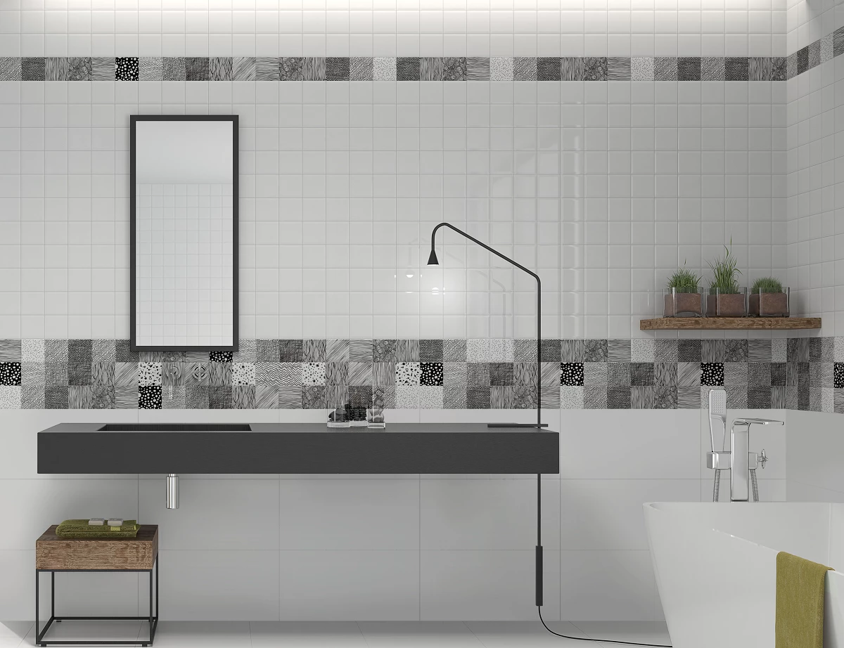 The Kapen feature tile is the perfect choice for creating a rustic look in your bathroom. This unique modernist Kapen tile features sketches on each tile that evoke textures like braided wool, chain and scale mail, & homespun fabric.